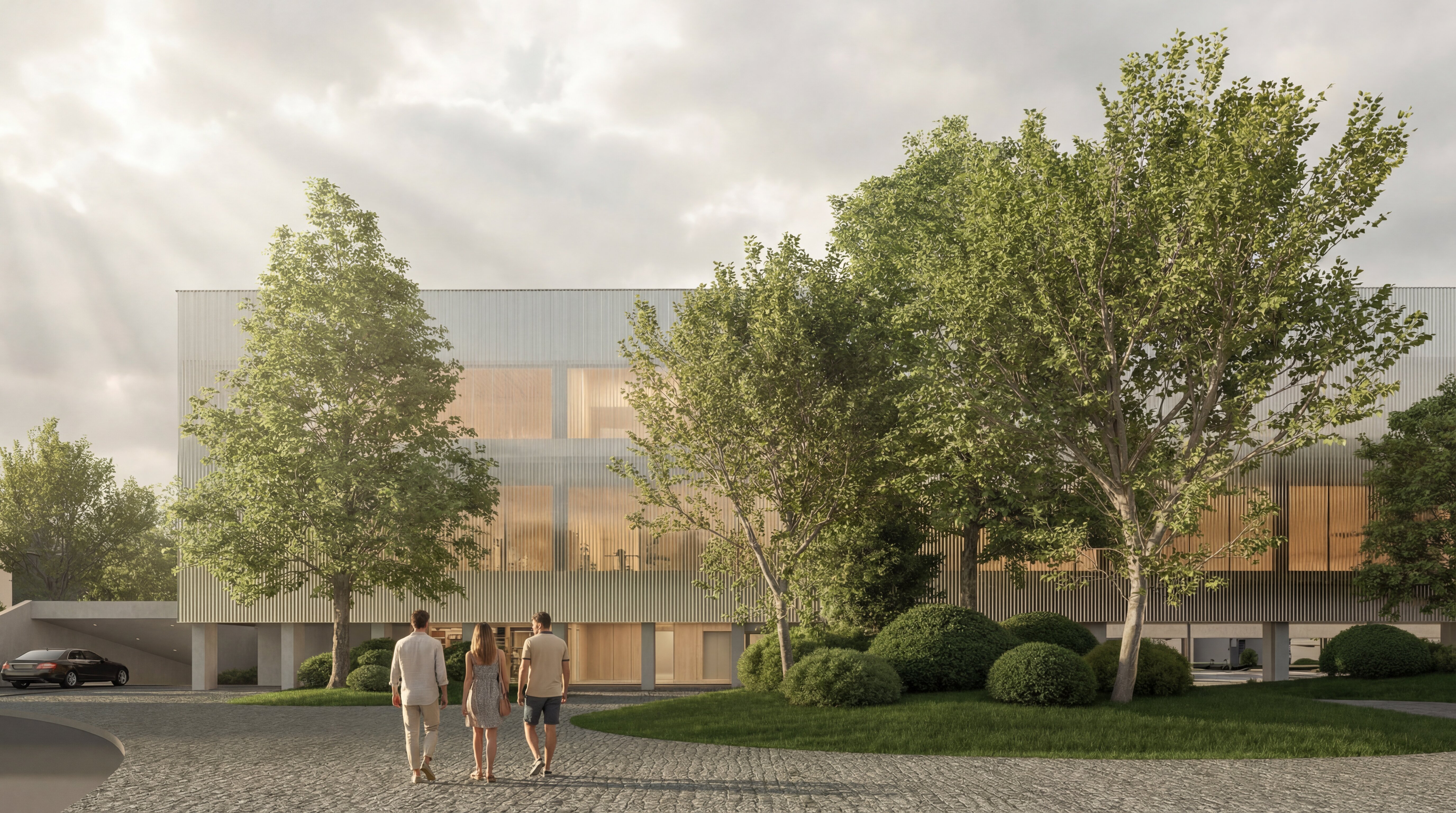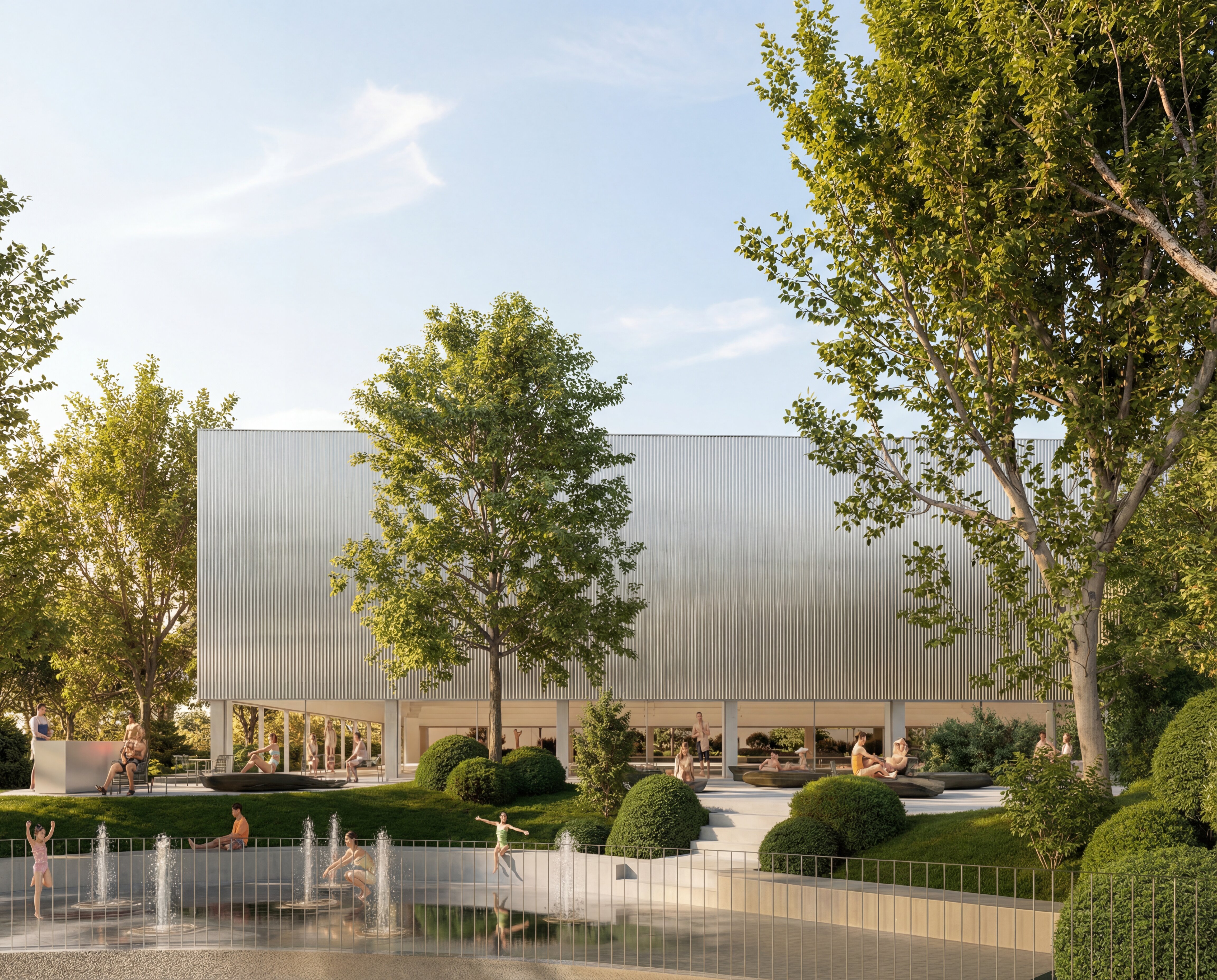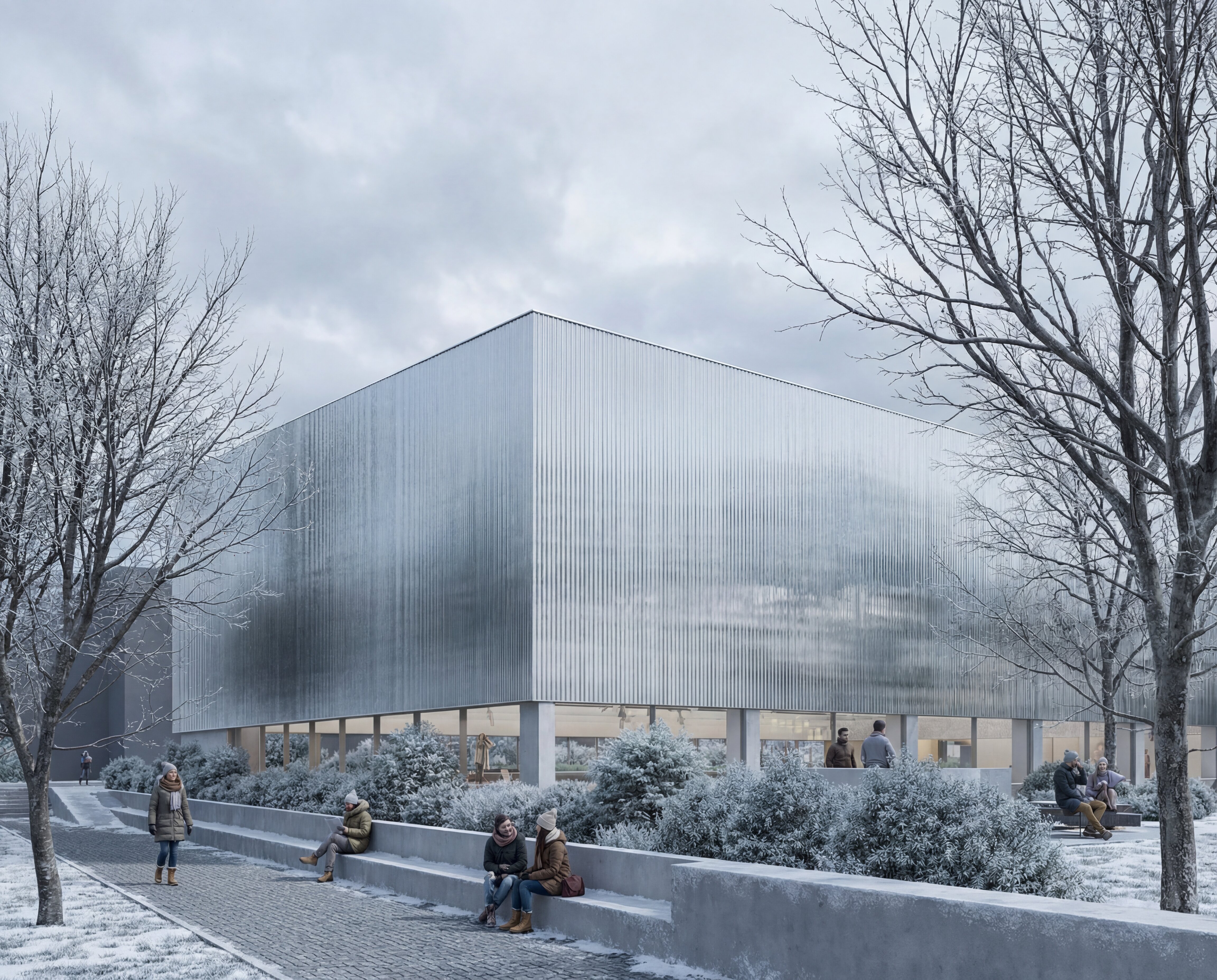 The building envelope, composed of reflective undulating aluminium panels, captures fragmented reflections of the surrounding trees and sky, allowing the renewed greenery of the park to visually resonate through the structure. Rather than producing sharp mirror images, the surface softly diffuses light and multiplies the presence of the landscape, while the ground level remains fluid and permeable - where paths, vegetation and water surfaces create a continuous spatial experience that dissolves the boundary between interior and exterior.