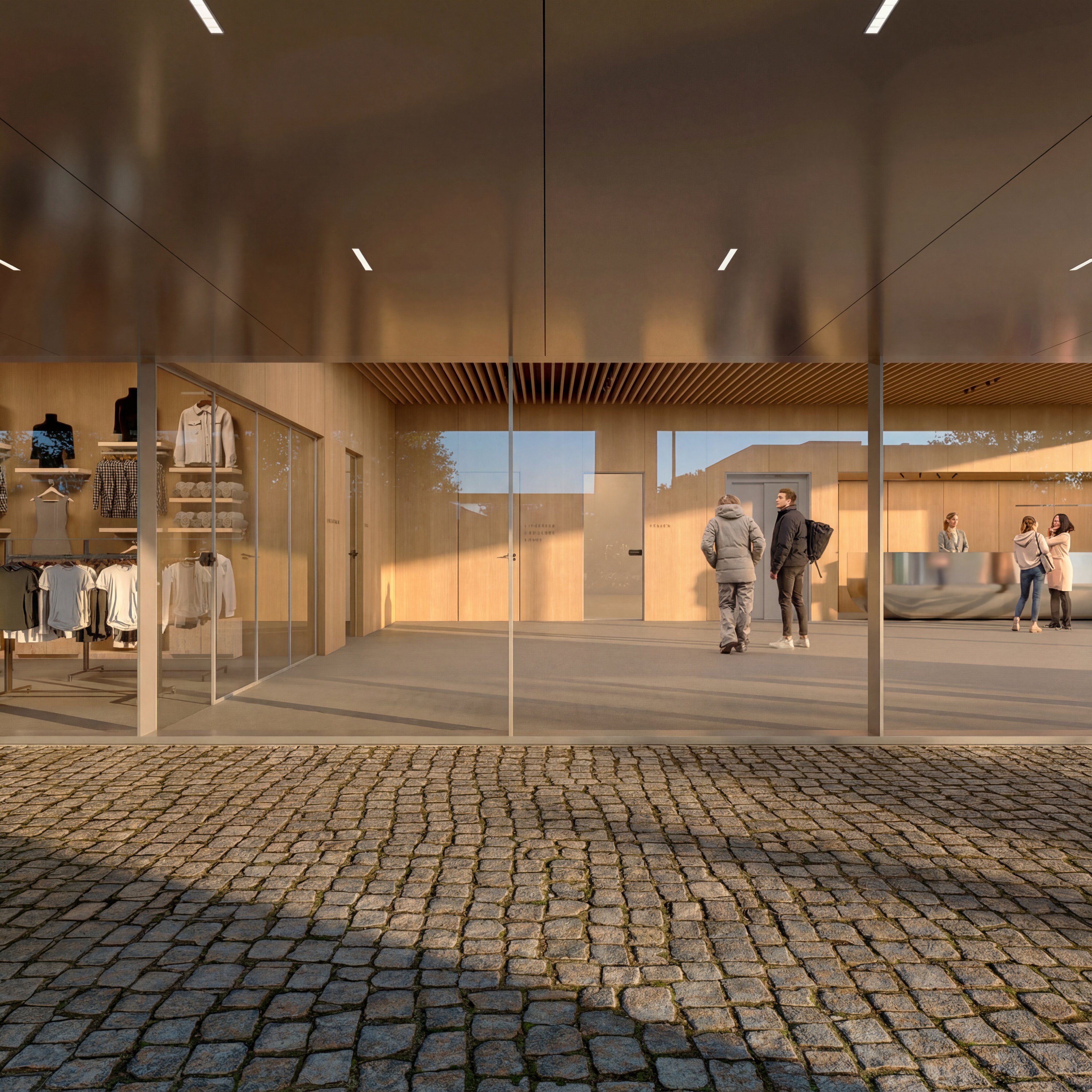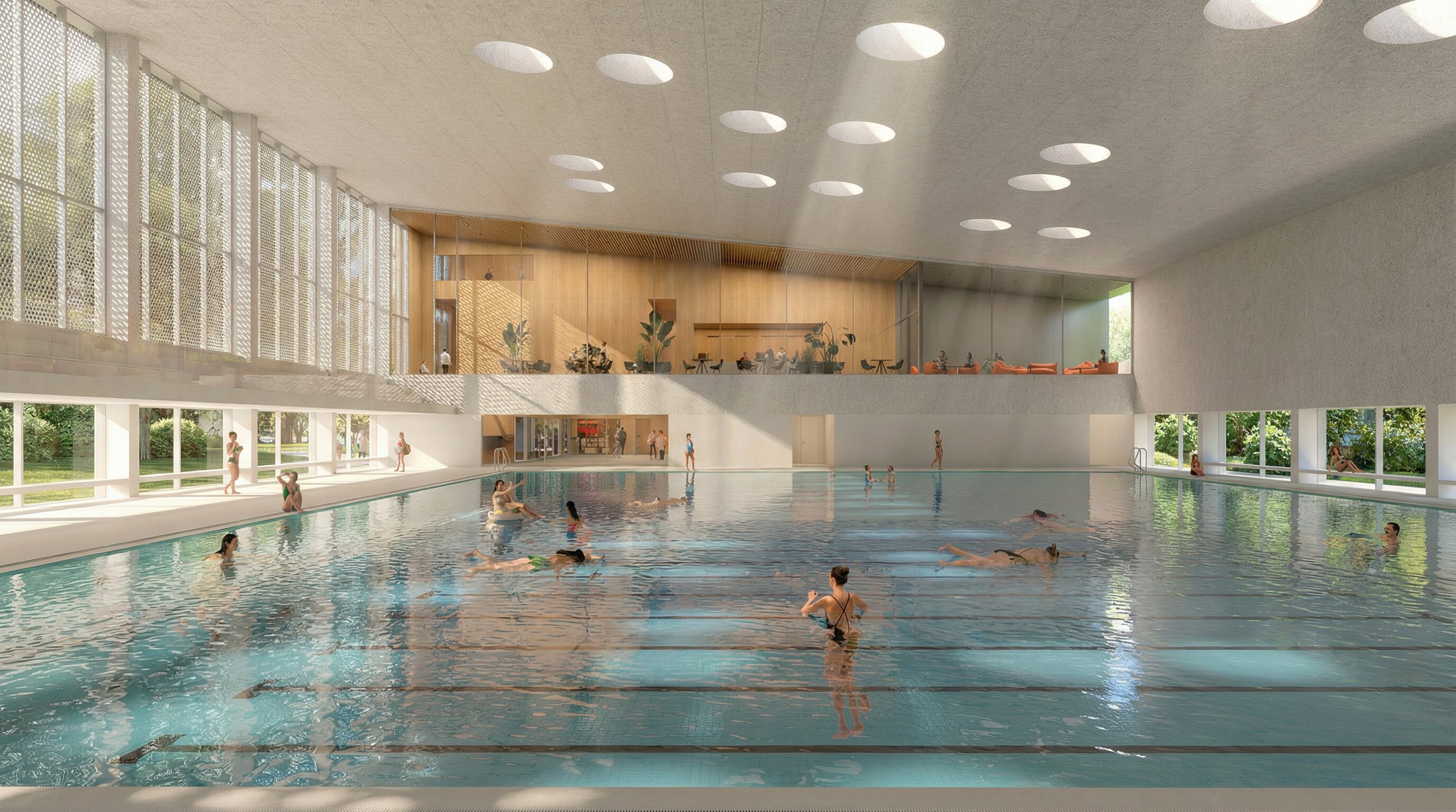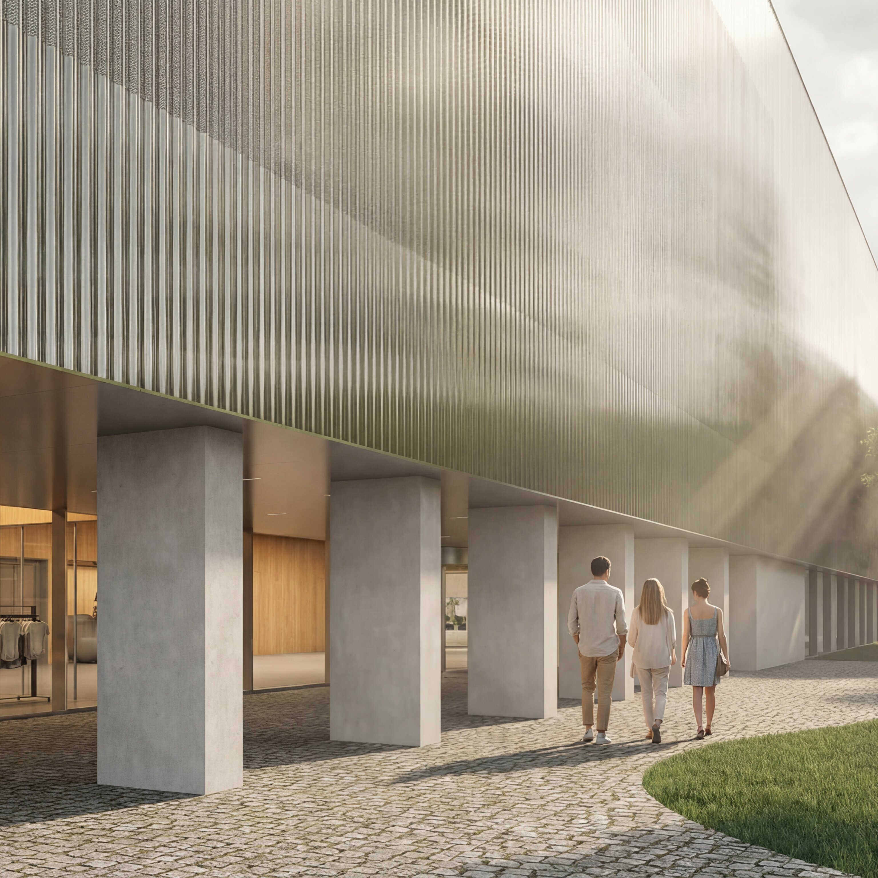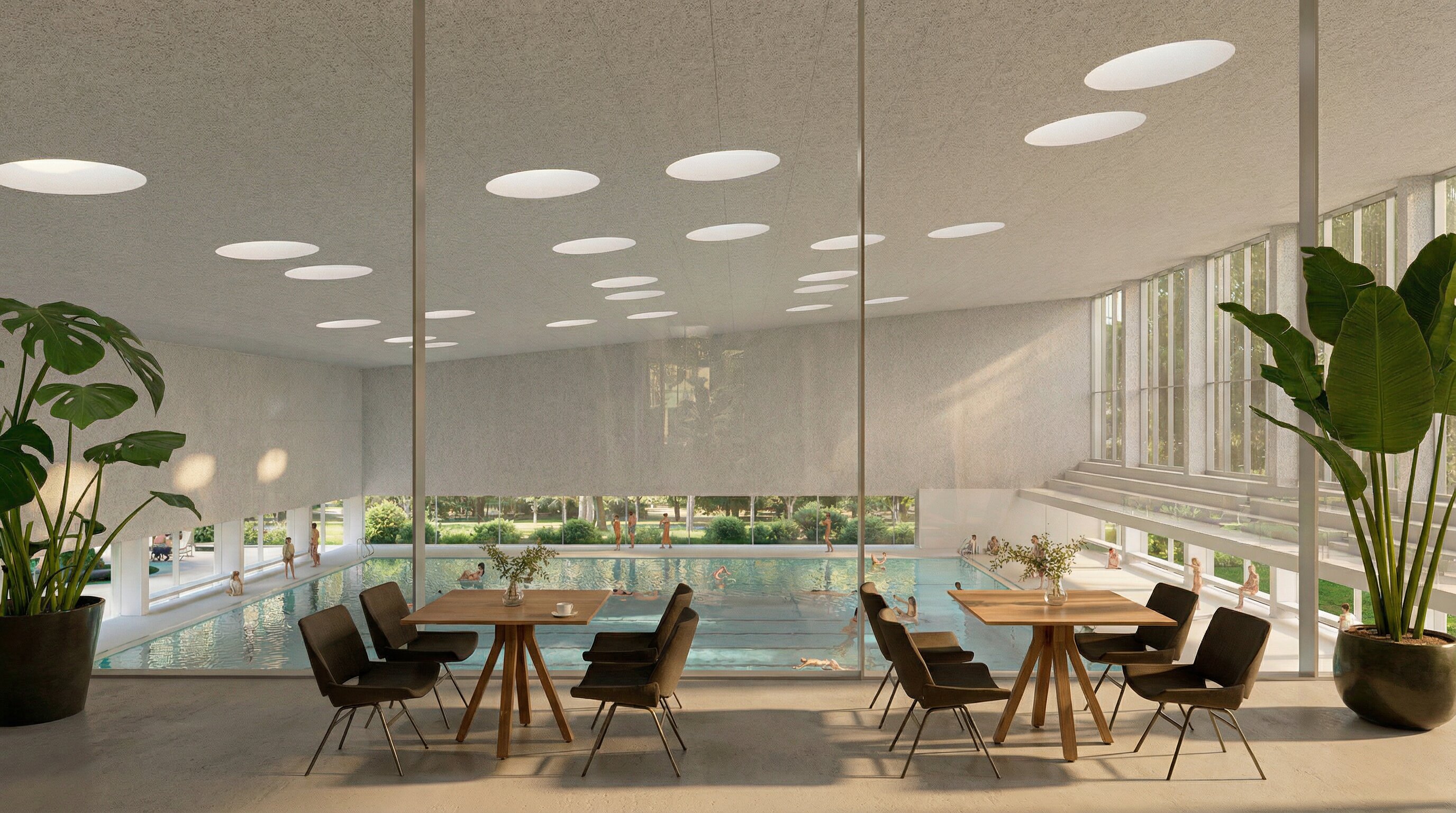 The building envelope, composed of reflective undulating aluminium panels, captures fragmented reflections of the surrounding trees and sky, allowing the renewed greenery of the park to visually resonate through the structure. Rather than producing sharp mirror images, the surface softly diffuses light and multiplies the presence of the landscape, while the ground level remains fluid and permeable - where paths, vegetation and water surfaces create a continuous spatial experience that dissolves the boundary between interior and exterior.