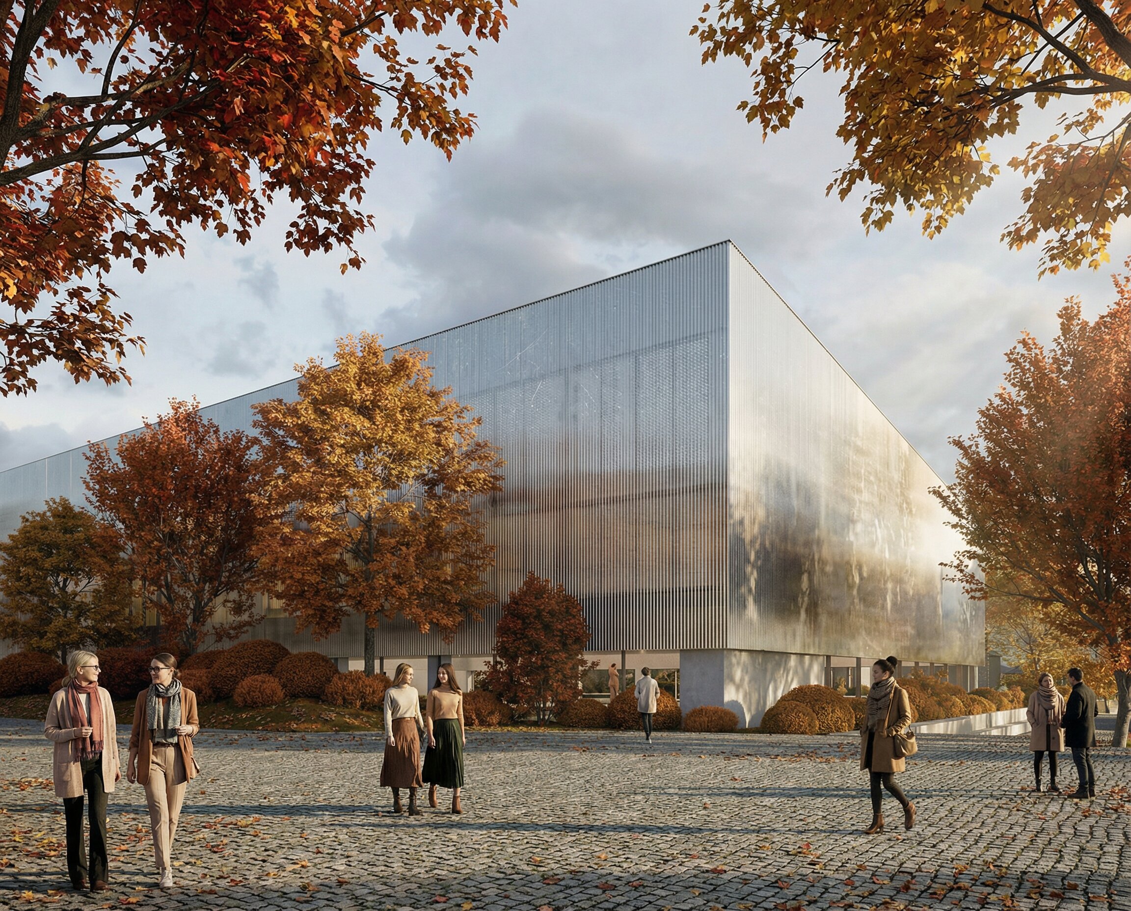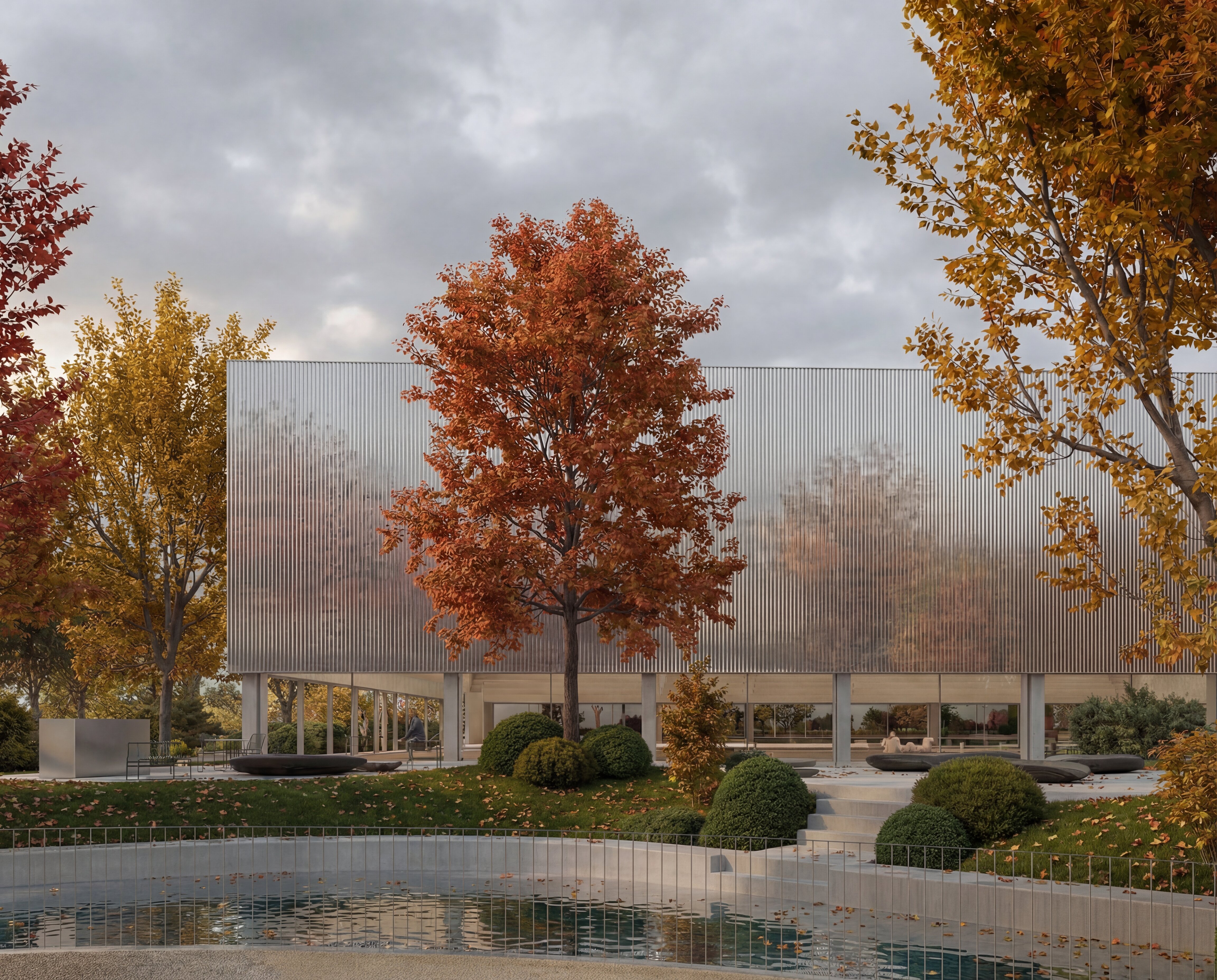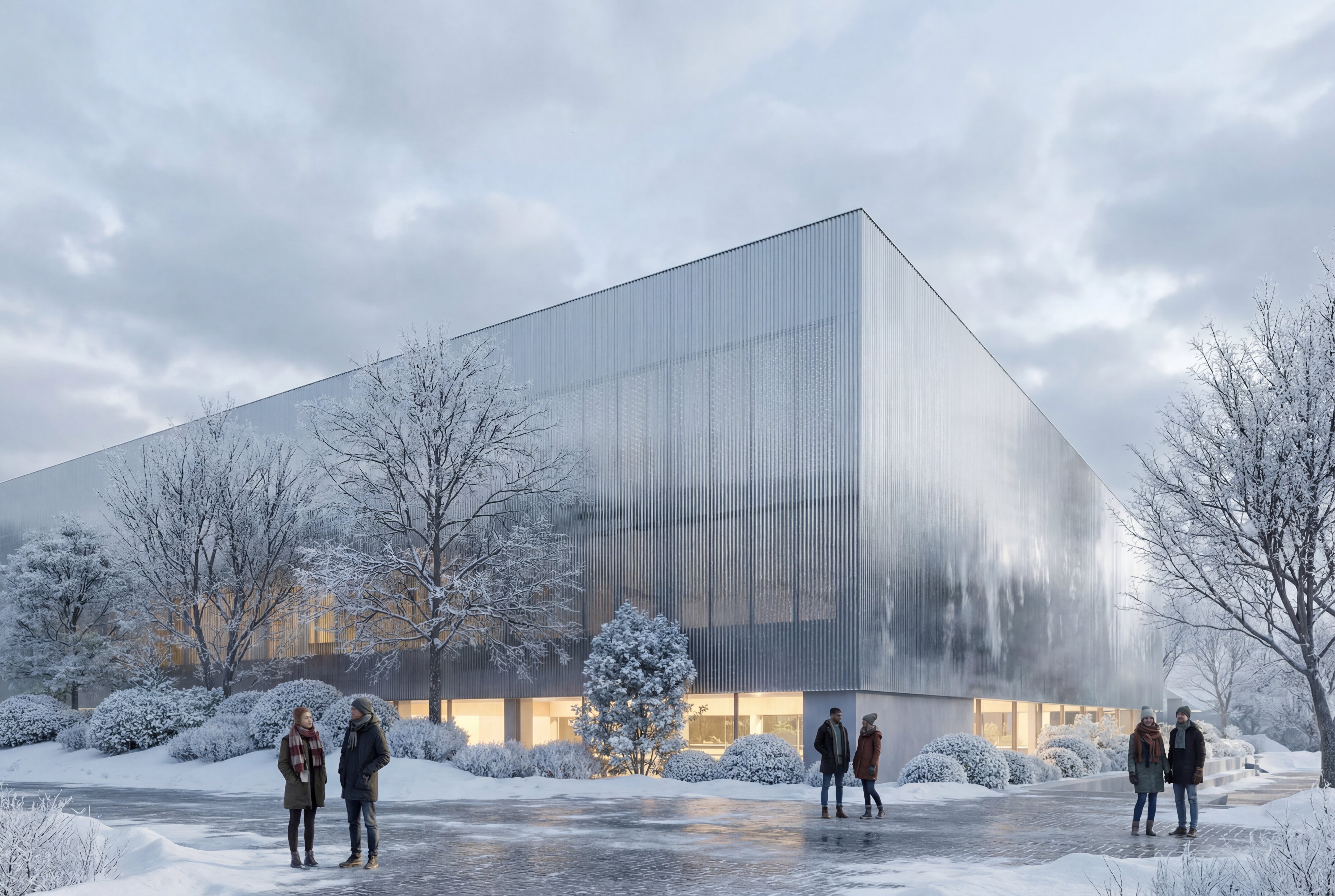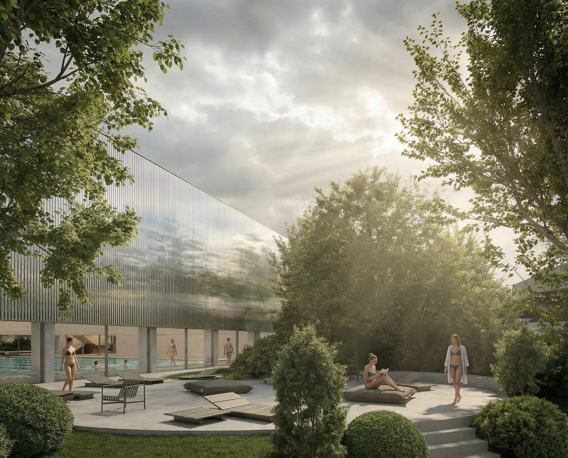The building envelope, composed of reflective undulating aluminium panels, captures fragmented reflections of the surrounding trees and sky, allowing the renewed greenery of the park to visually resonate through the structure. Rather than producing sharp mirror images, the surface softly diffuses light and multiplies the presence of the landscape, while the ground level remains fluid and permeable - where paths, vegetation and water surfaces create a continuous spatial experience that dissolves the boundary between interior and exterior.