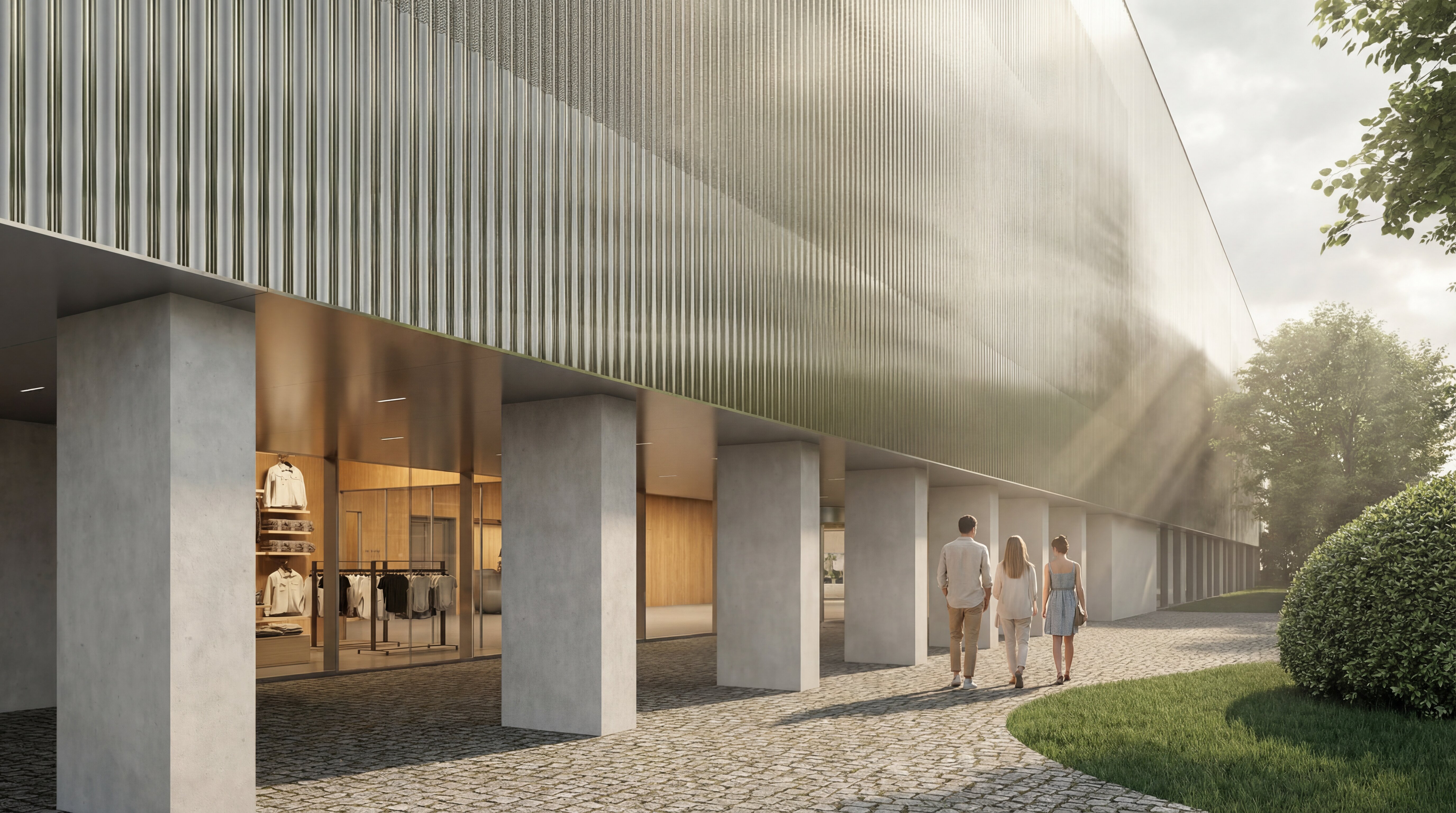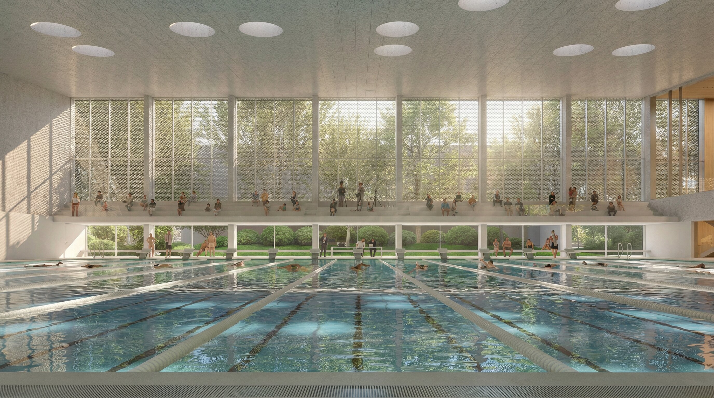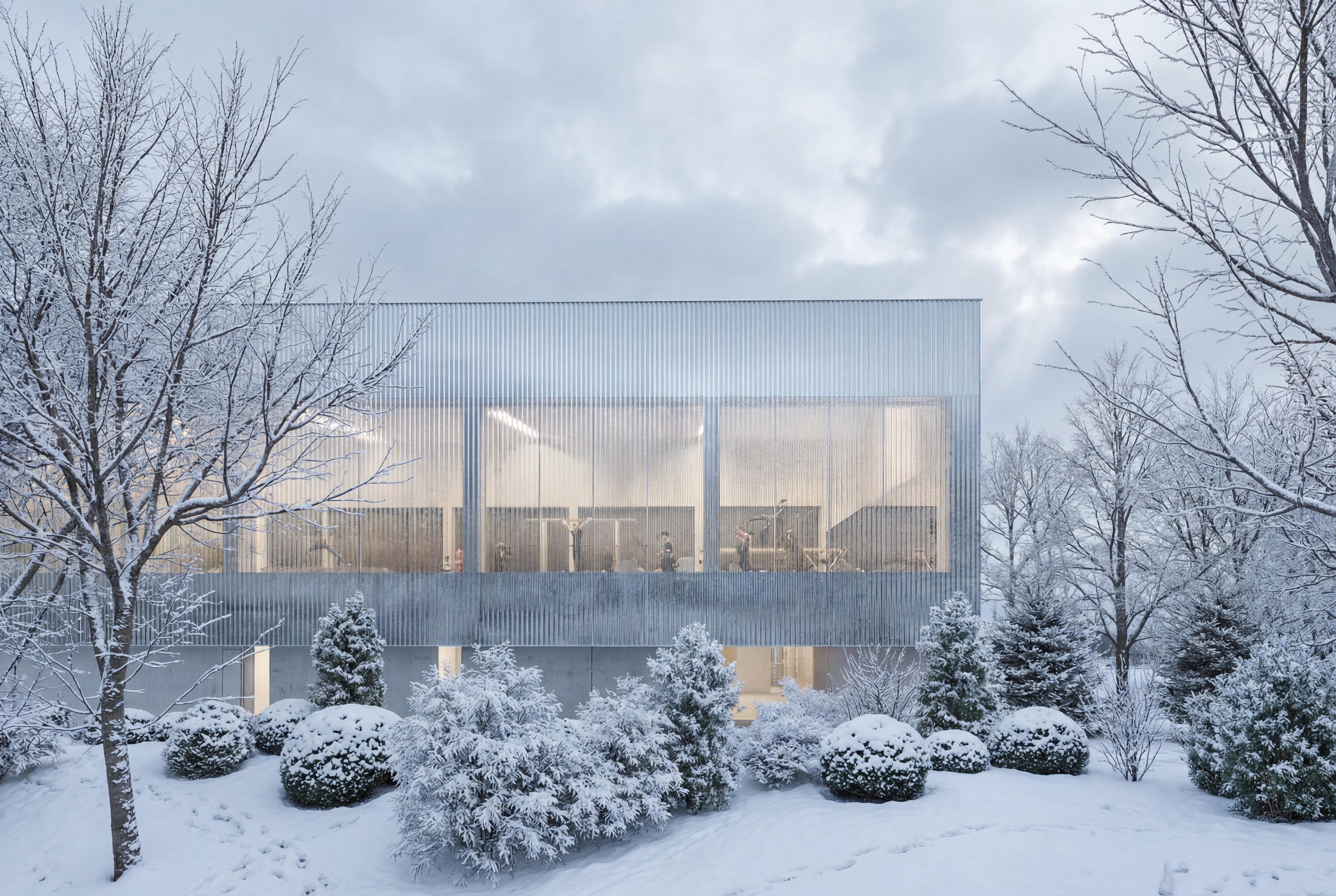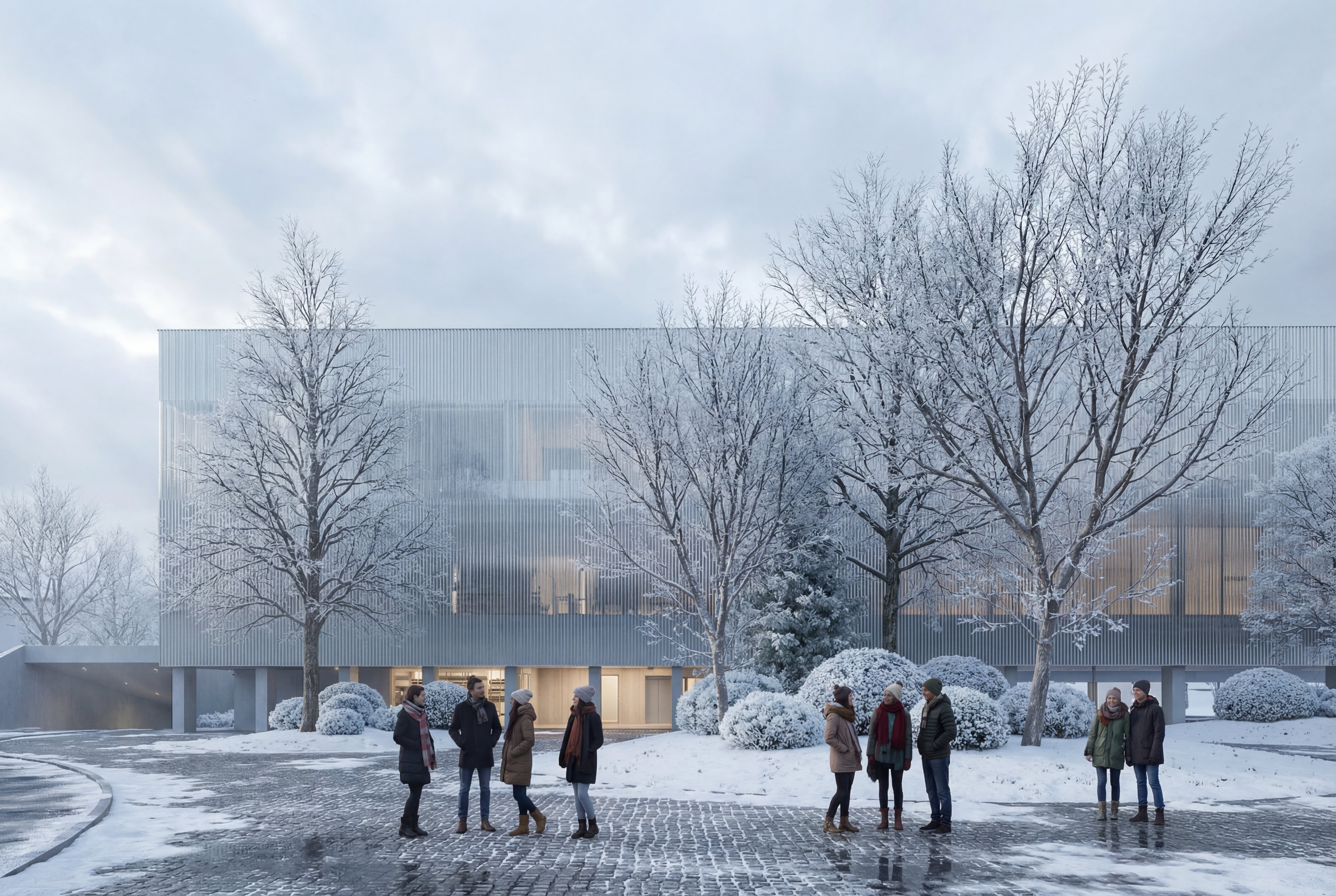 The building envelope, composed of reflective undulating aluminium panels, captures fragmented reflections of the surrounding trees and sky, allowing the renewed greenery of the park to visually resonate through the structure. Rather than producing sharp mirror images, the surface softly diffuses light and multiplies the presence of the landscape, while the ground level remains fluid and permeable - where paths, vegetation and water surfaces create a continuous spatial experience that dissolves the boundary between interior and exterior.