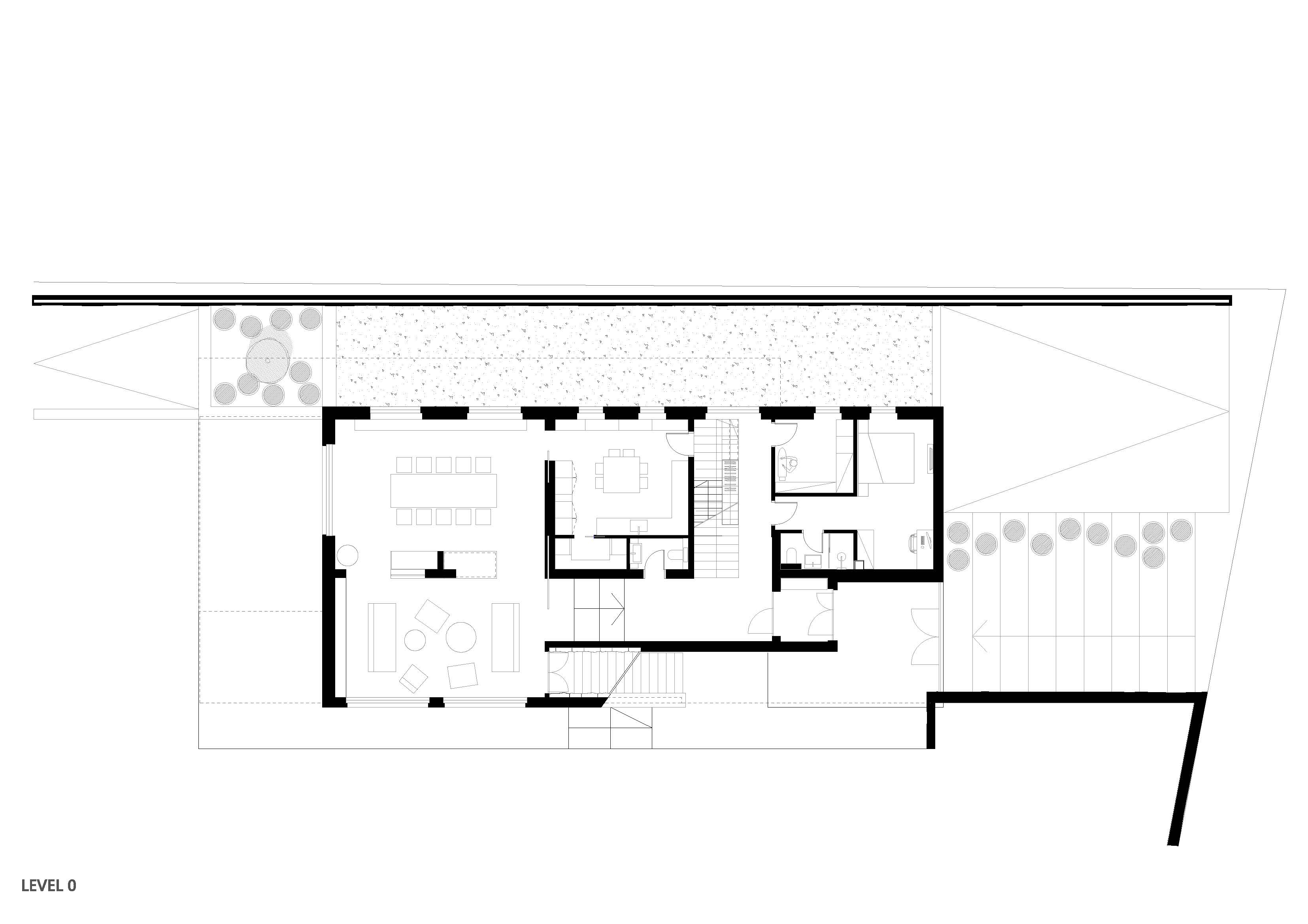 The irregular shaped plot is closed toward the neighbors by the stone wall, but opened to natural landscape by great glass surfaces. The social functions are placed in ground floor, on contrary the upper floors which consist of two cantilevered blocks where one is purposed to be mainly used by children and the other by parents. Auxiliary facilities and garage are planned for basement.